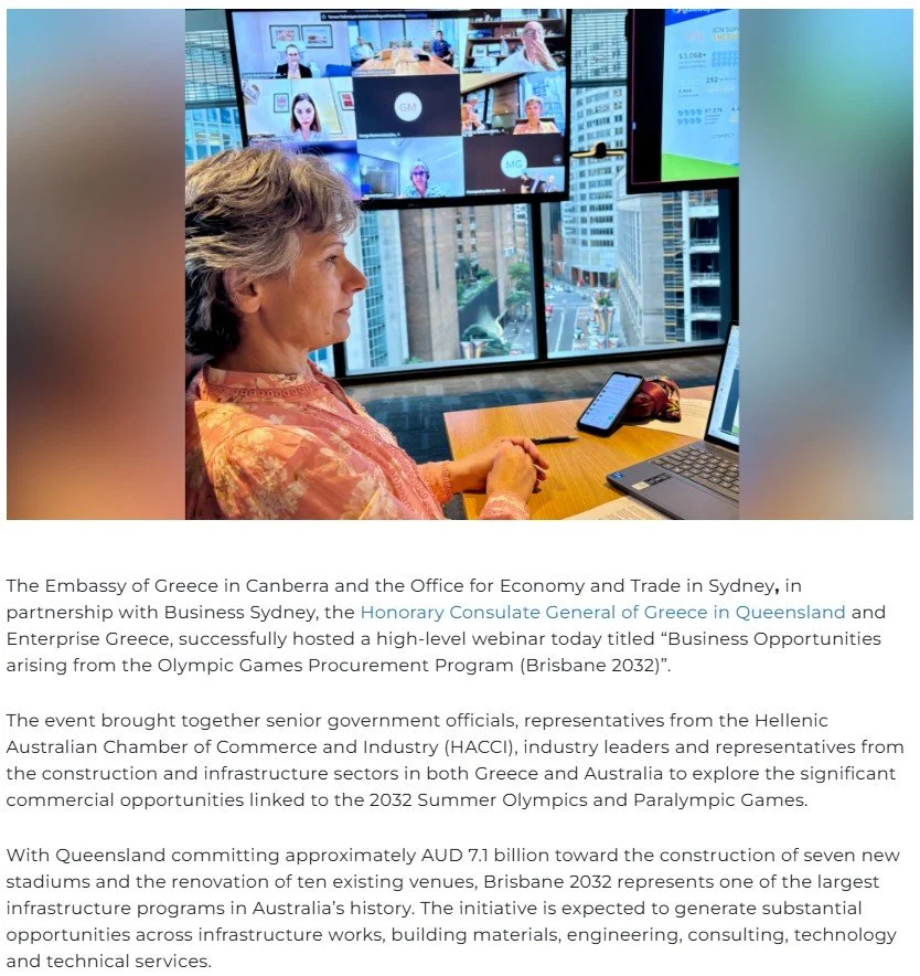 A high‑level Greece–Australia webinar outlines major procurement opportunities ahead of the 2032 Olympic Games. https://greekherald.com.au/news/greece-and-australia-strengthen-business-ties-at-brisbane-2032-olympic-procurement-webinar/